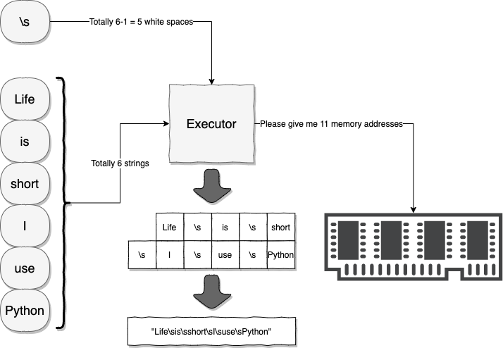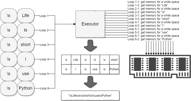 - Sau đó, executor nhận ra rằng khoảng trắng cần được nối với một chuỗi, vì vậy nó sẽ áp dụng cho địa chỉ bộ nhớ cho chuỗi s, đó là vòng lặp đầu