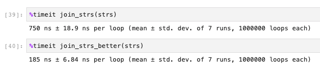 Nhưng join() trong Python không chỉ làm syntax ngắn hơn, mà vể mặt performance join() cũng đạt kết quả tốt hơn.