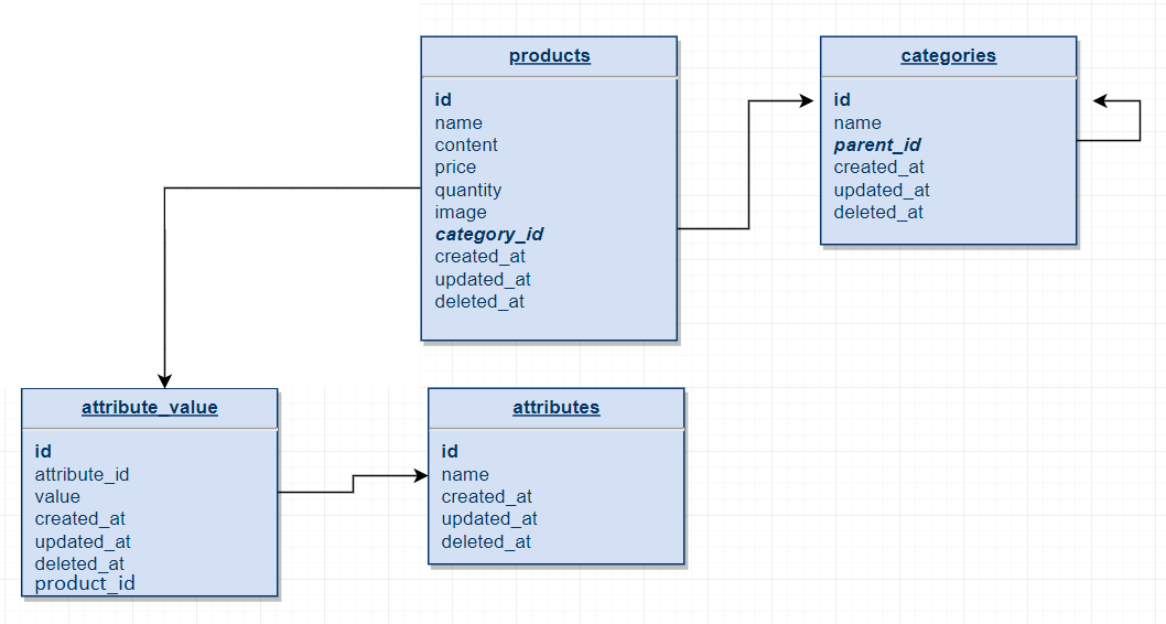 - Value - Attribute: 1-n (một Attribute có nhiều Value)