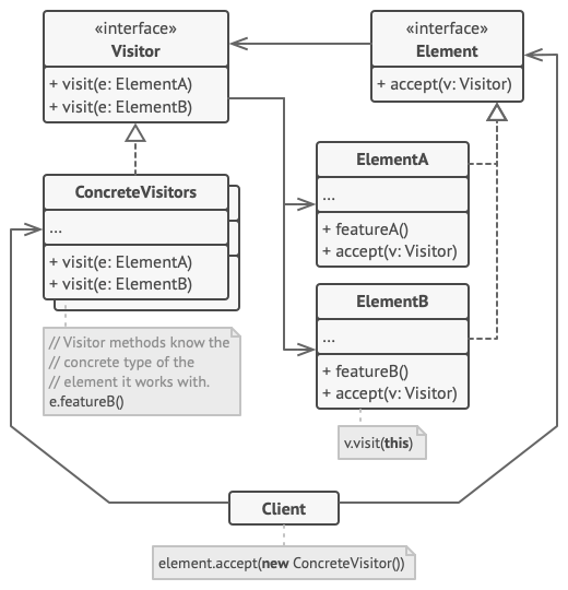 Để làm được điều này, các đối tượng (Element) phải tách các thao tác đó ra phương thức riêng và định nghĩa chúng trên các lớp tách biệt gọi là các lớp Visitor. Nhờ vậy các thao tác được tách độc lập ra khỏi cấu trúc đối tượng, giúp cho việc thay đổi thao tác trở nên linh hoạt.